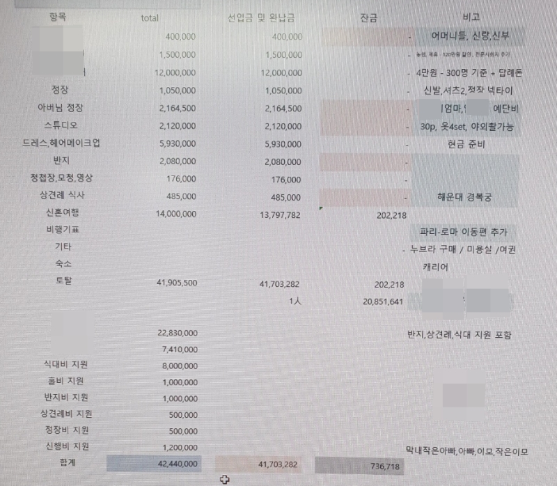 결혼식이 끝난 지는 좀 됐고, 총 결혼식 비용 및 추가 지출 방지를 위한 유의사항을 알려드리고자 합니다.