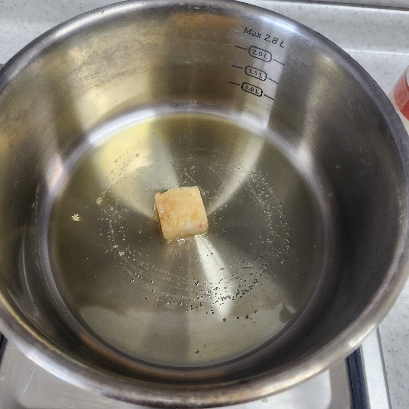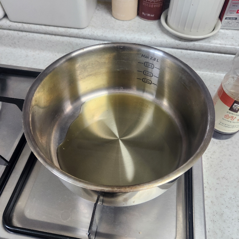 1) 냄비에 올리브유+들기름을 넣고 달궈줍니다. 들기름은 가열하면 발암물질이 나온대서 버터 쓸 때처럼 발연점 높이려고 요즘 올리브유 섞어 쓰네요.