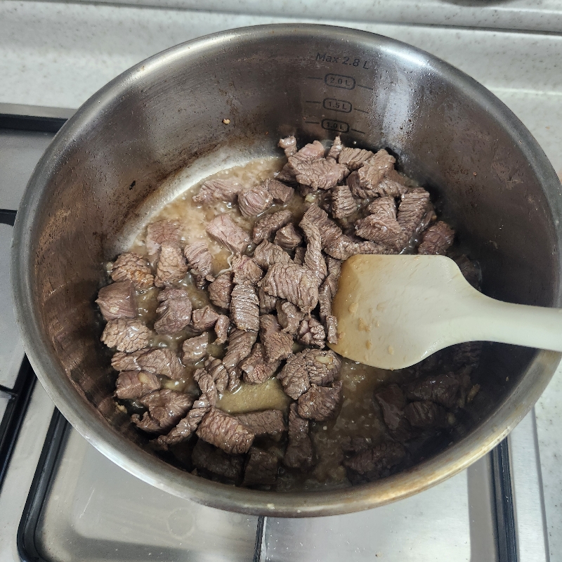 4. 적당히 마늘향이 우러난 기름에 소고기를 넣어줍니다. 비린내만 아니었으면 소고기도 굳이...술에 안재웠을거에요. 어차피 핏물이 나중에 거품으로 올라오면 걷으면 되거든요.