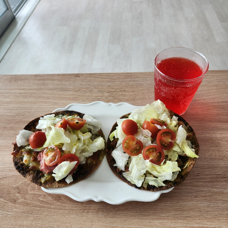 다음날 아침, 햄 대신 토르티야에 올려 랩처럼 싸먹었습니다. 토르티야에 바질페스토와 목살을 올려 굽고, 양상추와 방울토마토를 올려 체리소다와 맛나게 먹었습니다. 목살이 맛이 좋아 그런지 뭘로 먹어도 좋았습니다.