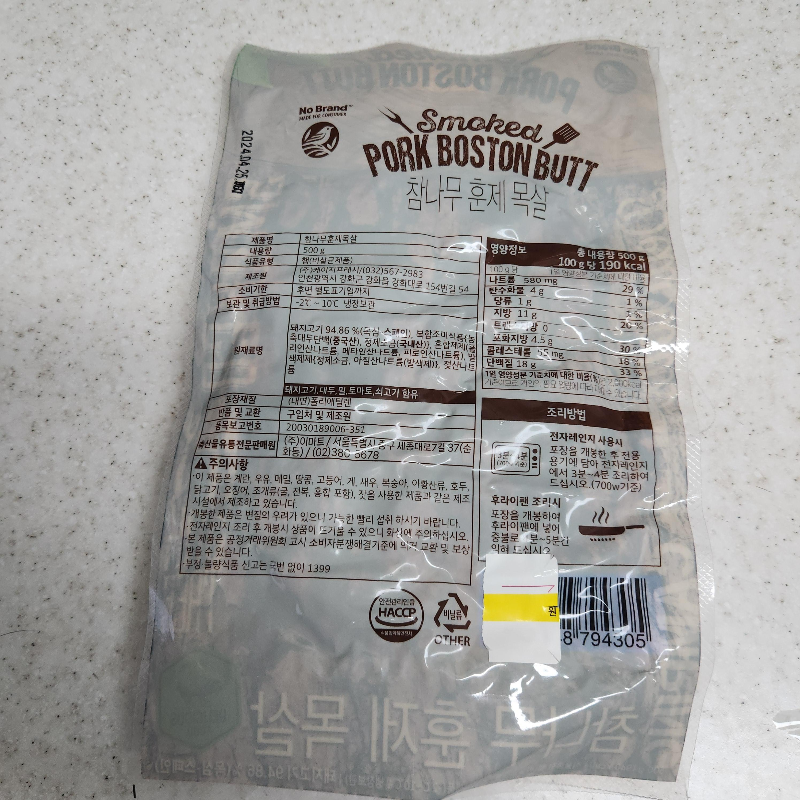 훈제오리와 마찬가지로, 훈제 목살은 햄입니다. 아질산나트륨이 들어가는 걸 보면 알 수 있죠. 그래도 간 고기도 아니고, 야채랑 먹으면 맛있는 건 동일하기 때문에 세일하는 것 보고 바로 집어왔습니다. 원가는 6900원대인데, 할인해서 4900원대였습니다.